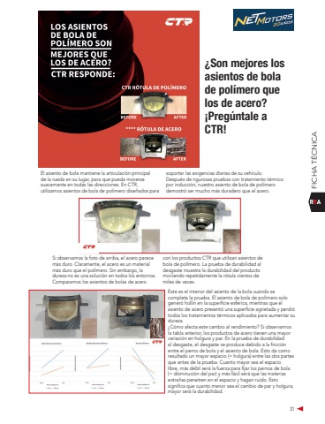 31FICHA T%u00c9CNICAEl asiento de bola mantiene la articulaci%u00f3n principal de la rueda en su lugar, para que pueda moverse suavemente en todas las direcciones. En CTR, utilizamos asientos de bola de pol%u00edmero dise%u00f1ados para soportar las exigencias diarias de su veh%u00edculo.Despu%u00e9s de rigurosas pruebas con tratamiento t%u00e9rmico por inducci%u00f3n, nuestro asiento de bola de pol%u00edmero demostr%u00f3 ser mucho m%u00e1s duradero que el acero.%u00bfSon mejores los asientos de bola de pol%u00edmero que los de acero? %u00a1Preg%u00fantale a CTR!Si observamos la foto de arriba, el acero parece m%u00e1s duro. Claramente, el acero es un material m%u00e1s duro que el pol%u00edmero. Sin embargo, la dureza no es una soluci%u00f3n en todos los entornos.Comparamos los asientos de bolas de acero con los productos CTR que utilizan asientos de bola de pol%u00edmero. La prueba de durabilidad al desgaste muestra la durabilidad del producto moviendo repetidamente la r%u00f3tula cientos de miles de veces.Este es el interior del asiento de la bola cuando se completa la prueba. El asiento de bola de pol%u00edmero solo gener%u00f3 holl%u00edn en la superficie esf%u00e9rica, mientras que el asiento de acero present%u00f3 una superficie agrietada y perdi%u00f3 todos los tratamientos t%u00e9rmicos aplicados para aumentar su dureza. %u00bfC%u00f3mo afecta este cambio al rendimiento? Si observamos la tabla anterior, los productos de acero tienen una mayor variaci%u00f3n en holgura y par. En la prueba de durabilidad al desgaste, el desgaste se produce debido a la fricci%u00f3n entre el perno de bola y el asiento de bola. Esto da como resultado un mayor espacio (= holgura) entre las dos partes que antes de la prueba. Cuanto mayor sea el espacio libre, m%u00e1s d%u00e9bil ser%u00e1 la fuerza para fijar los pernos de bola (= disminuci%u00f3n del par) y m%u00e1s f%u00e1cil ser%u00e1 que las materias extra%u00f1as penetren en el espacio y hagan ruido. Esto significa que cuanto menor sea el cambio de par y holgura, mayor ser%u00e1 la durabilidad.