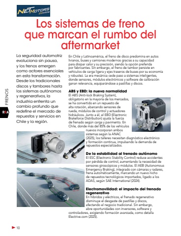 10FRENOSLos sistemas de freno que marcan el rumbo del aftermarketEn Chile y Latinoam%u00e9rica, el freno de disco predomina en autos livianos, buses y camiones modernos gracias a su capacidad para disipar calor y su precisi%u00f3n, siendo la opci%u00f3n preferida por fabricantes. Sin embargo, el freno de tambor persiste en veh%u00edculos de carga ligera y ejes traseros de buses por su econom%u00eda y robustez. La era mec%u00e1nica cede paso a sistemas inteligentes, donde sensores, m%u00f3dulos electr%u00f3nicos y software de calibraci%u00f3n ganan relevancia, equipar%u00e1ndose a pastillas y discos.ABS y EBD: la nueva normalidadEl ABS (Anti-lock Braking System), obligatorio en la mayor%u00eda de los mercados, se ha convertido en un repuesto de alta rotaci%u00f3n, abarcando sensores de rueda, m%u00f3dulos de control y actuadores hidr%u00e1ulicos. Junto a %u00e9l, el EBD (Electronic Brakeforce Distribution) ajusta la fuerza de frenado seg%u00fan carga y pavimento. En Chile, donde m%u00e1s del 85% de los veh%u00edculos nuevos incorporan ambos sistemas seg%u00fan la ANAC (2025), los talleres necesitan diagn%u00f3stico electr%u00f3nico y formaci%u00f3n continua, impulsando la demanda de repuestos especializados.De la estabilidad al frenado aut%u00f3nomoEl ESC (Electronic Stability Control) reduce accidentes por p%u00e9rdida de control, aumentando la necesidad de sensores girosc%u00f3picos y m%u00f3dulos. El AEB (Autonomous Emergency Braking), integrado con c%u00e1maras y radares, frena autom%u00e1ticamente, marcando un nuevo nicho de repuestos tecnol%u00f3gicos importados, ligado a los ADAS, seg%u00fan SAE International (2024).Electromovilidad: el impacto del frenado regenerativoEn h%u00edbridos y el%u00e9ctricos, el frenado regenerativo disminuye el desgaste de pastillas y discos, afectando el negocio tradicional. Sin embargo, abre oportunidades con inversores, software y controladores, exigiendo formaci%u00f3n avanzada, como detalla Electrive.com (2025).La seguridad automotriz evoluciona sin pausa, y los frenos emergen como actores esenciales en esta transformaci%u00f3n. Desde los tradicionales discos y tambores hasta los sistemas aut%u00f3nomos y regenerativos, la industria enfrenta un cambio profundo que redefine el mercado de repuestos y servicios en Chile y la regi%u00f3n.