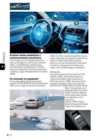 12FRENOSEl futuro: frenos predictivos y estacionamiento electr%u00f3nicoTecnolog%u00edas como el frenado predictivo, que usa inteligencia artificial para anticipar tr%u00e1fico, y los EPB (frenos electr%u00f3nicos), que reemplazan la palanca por un bot%u00f3n, requieren diagn%u00f3stico de punta y repuestos complejos, seg%u00fan Mercedes-Benz Innovation (2025).Un mercado en expansi%u00f3nEl mercado global de frenos proyecta superar los USD 50.000 millones anuales para 2030, con un auge en electr%u00f3nica (Statista, 2024). En Chile, la venta de pastillas y discos sigue s%u00f3lida, pero los repuestos electr%u00f3nicos crecen. El aftermarket debe capacitar t%u00e9cnicos, renovar herramientas y diversificar inventarios, integrando tecnolog%u00eda para liderar una movilidad segura y sostenible.Bibliograf%u00eda:Asociaci%u00f3n Nacional Automotriz de Chile (ANAC). (2025). Informe de tendencias automotrices 2025. https://www.anac.clSAE International. (2024). Advanced Driver Assistance Systems. https://www.sae.orgElectrive.com. (2025). Electromobility Trends. https://www.electrive.comMercedes-Benz Innovation. (2025). Predictive Braking Technology. https://group.mercedes-benz.com/innovationStatista. (2024). Global Brake Components Market. https://www.statista.com