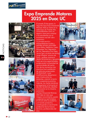 22NOTICIASEl pasado 25 de agosto, la Segunda Feria Expo Emprende Motores 2025 se realiz%u00f3 en la sede Duoc UC Puente Alto, consolid%u00e1ndose como un espacio clave para conectar a los estudiantes con el ecosistema real del rubro automotriz.La jornada reuni%u00f3 a emprendedores locales y grandes actores nacionales como Refax, NetMotor, Caren, Milwaukee Tool, Repuestos del Sol, Repuestos Don Pepe, Javcar Spa y el piloto de karting Jorge Villagr%u00e1n -alumno de Duoc-, quienes mostraron desde herramientas y repuestos hasta servicios especializados, evidenciando la diversidad de oportunidades del sector.Uno de los momentos m%u00e1s atractivos fue la exhibici%u00f3n de veh%u00edculos potenciados de Motortech, cuyas modificaciones despertaron gran inter%u00e9s entre los asistentes, uniendo la teor%u00eda con la experiencia pr%u00e1ctica. Adem%u00e1s, las charlas tem%u00e1ticas enriquecieron la formaci%u00f3n al abordar tendencias, desaf%u00edos e innovaci%u00f3n en la industria automotriz.La Expo Emprende Motores 2025 dej%u00f3 en claro que integrar conocimiento, pasi%u00f3n y experiencia real fortalece el v%u00ednculo entre la academia y el mundo productivo, contribuyendo al crecimiento profesional de los futuros t%u00e9cnicos y profesionales del %u00e1rea.Expo Emprende Motores 2025 en Duoc UC