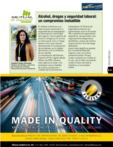 23SEGURIDADEn talleres mec%u00e1nicos y en todo el sector automotriz, la seguridad de los trabajadores es clave para la continuidad del negocio. Hoy, la gesti%u00f3n de alcohol y drogas ya no es solo un tema social, sino un riesgo laboral cr%u00edtico que impacta directamente en la prevenci%u00f3n de accidentes, en la calidad del servicio y en la confianza de los clientes.La actualizaci%u00f3n del Decreto Supremo N%u00b044, vigente desde febrero de 2025, refuerza esta urgencia al exigir a las empresas nuevas medidas de control, prevenci%u00f3n y cuidado de la salud de sus trabajadores. En Mutual de Seguridad contamos con herramientas como la Encuesta IRE y m%u00f3dulos de capacitaci%u00f3n espec%u00edficos, que permiten a las organizaciones diagnosticar, sensibilizar y actuar de manera proporcional al nivel de riesgo detectado.Asumir este desaf%u00edo es apostar por la sostenibilidad del negocio y por una cultura preventiva s%u00f3lida. Porque cuidar a quienes nos cuidan en la ruta o en el taller, es tambi%u00e9n cuidar el futuro de toda la industria y a la sociedad entera.Alcohol, drogas y seguridad laboral: un compromiso ineludibleAng%u00e9lica Zelaya AhumadaGerente de Clientes y Servicios de Transportes, Energ%u00eda, Telecomunicaciones e Industrias