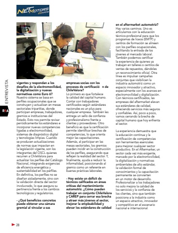 28ENTREVISTAvigentes y respondan a los desaf%u00edos de la electromovilidad, la digitalizaci%u00f3n y nuevas normativas como Euro 6?Nuestro sistema se basa en perfiles ocupacionales que se construyen y actualizan en mesas sectoriales tripartitas, donde participan empresas, trabajadores, gremios e instituciones del Estado. Esto nos permite revisar peri%u00f3dicamente los est%u00e1ndares e incorporar nuevas competencias ligadas a electromovilidad, sistemas de diagn%u00f3stico digital y tecnolog%u00edas limpias. Cuando se producen actualizaciones de normas que impactan en la legislaci%u00f3n vigente, son los integrantes del OSCL quienes recurren a ChileValora para actualizar los perfiles del Cat%u00e1logo Nacional, integrando exigencias de eficiencia energ%u00e9tica y sustentabilidad en los perfiles. En definitiva, los perfiles no se dise%u00f1an aisladamente, sino con la validaci%u00f3n directa del sector involucrado, lo que asegura su pertinencia frente a los cambios tecnol%u00f3gicos y regulatorios.- %u00bfQu%u00e9 beneficios concretos puede obtener una c%u00e1mara gremial al vincular a sus empresas socias con los procesos de certificaci%u00f3 n de ChileValora?Lo primero es que fortalece la calidad del capital humano. Contar con trabajadores certificados seg%u00fan est%u00e1ndares nacionales es un plus para cualquier empresa. Tambi%u00e9n les entrega un sello de confianza y profesionalismo frente a clientes y proveedores. Otro beneficio es que la certificaci%u00f3n permite identificar brechas de competencias, lo que orienta mejor las capacitaciones. Adem%u00e1s, al participar en las mesas sectoriales, los gremios pueden incidir en la construcci%u00f3n de los perfiles, asegurando que reflejen la realidad del sector. Y, finalmente, ayuda a reducir la informalidad, posicionando al gremio como un referente en buenas pr%u00e1cticas laborales.- Hoy existe un d%u00e9ficit de t%u00e9cnicos calificados en %u00e1reas cr%u00edticas del mantenimiento automotriz. %u00bfC%u00f3mo pueden trabajar en conjunto ChileValora y CAREP para cerrar esa brecha y atraer m%u00e1s j%u00f3venes al sector, mejorar la empleabilidad y elevar los est%u00e1ndares de calidad en el aftermarket automotriz?Hay varios caminos. Uno es articularnos con la educaci%u00f3n t%u00e9cnico-profesional para que los programas de liceos (EMTP) y centros de formaci%u00f3n se alineen con los perfiles ocupacionales, facilitando la entrada de los j%u00f3venes al mercado laboral. Tambi%u00e9n podemos certificar la experiencia de quienes ya trabajan en talleres o centros de ventas de repuestos, d%u00e1ndoles un reconocimiento oficial. Otra l%u00ednea es impulsar campa%u00f1as conjuntas que visibilicen la industria automotriz como un espacio innovador y atractivo, especialmente con los avances en electromovilidad y digitalizaci%u00f3n. Con t%u00e9cnicos certificados, las empresas del aftermarket elevan sus est%u00e1ndares de calidad, ofreciendo servicios m%u00e1s seguros y confiables. As%u00ed, poco a poco, vamos cerrando la brecha de capital humano que hoy enfrenta el sector.La experiencia demuestra que la educaci%u00f3n continua y la certificaci%u00f3n de competencias son herramientas esenciales para mejorar cualquier sector productivo. En el Aftermarker, un sector cada vez m%u00e1s exigente, marcado por la electromovilidad, la digitalizaci%u00f3n y normativas ambientales de alto est%u00e1ndar, la validaci%u00f3n formal de conocimientos y la capacitaci%u00f3n permanente se convierten en un motor de desarrollo. Profesionalizar a los trabajadores no solo mejora la calidad de los servicios y la confianza de los clientes, sino que tambi%u00e9n posiciona a la industria como un espacio atractivo, innovador y competitivo en el escenario nacional e internacional.