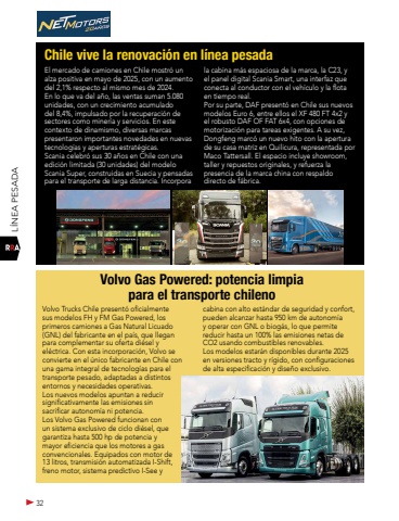 32L%u00cdNEA PESADAEl mercado de camiones en Chile mostr%u00f3 un alza positiva en mayo de 2025, con un aumento del 2,1% respecto al mismo mes de 2024. En lo que va del a%u00f1o, las ventas suman 5.080 unidades, con un crecimiento acumulado del 8,4%, impulsado por la recuperaci%u00f3n de sectores como miner%u00eda y servicios. En este contexto de dinamismo, diversas marcas presentaron importantes novedades en nuevas tecnolog%u00edas y aperturas estrat%u00e9gicas.Scania celebr%u00f3 sus 30 a%u00f1os en Chile con una edici%u00f3n limitada (30 unidades) del modelo Scania Super, construidas en Suecia y pensadas para el transporte de larga distancia. Incorpora la cabina m%u00e1s espaciosa de la marca, la C23, y el panel digital Scania Smart, una interfaz que conecta al conductor con el veh%u00edculo y la flota en tiempo real. Por su parte, DAF present%u00f3 en Chile sus nuevos modelos Euro 6, entre ellos el XF 480 FT 4x2 y el robusto DAF OF FAT 6x4, con opciones de motorizaci%u00f3n para tareas exigentes. A su vez, Dongfeng marc%u00f3 un nuevo hito con la apertura de su casa matriz en Quilicura, representada por Maco Tattersall. El espacio incluye showroom, taller y repuestos originales, y refuerza la presencia de la marca china con respaldo directo de f%u00e1brica.Chile vive la renovaci%u00f3n en l%u00ednea pesada Volvo Trucks Chile present%u00f3 oficialmente sus modelos FH y FM Gas Powered, los primeros camiones a Gas Natural Licuado (GNL) del fabricante en el pa%u00eds, que llegan para complementar su oferta di%u00e9sel y el%u00e9ctrica. Con esta incorporaci%u00f3n, Volvo se convierte en el %u00fanico fabricante en Chile con una gama integral de tecnolog%u00edas para el transporte pesado, adaptadas a distintos entornos y necesidades operativas. Los nuevos modelos apuntan a reducir significativamente las emisiones sin sacrificar autonom%u00eda ni potencia.Los Volvo Gas Powered funcionan con un sistema exclusivo de ciclo di%u00e9sel, que garantiza hasta 500 hp de potencia y mayor eficiencia que los motores a gas convencionales. Equipados con motor de 13 litros, transmisi%u00f3n automatizada I-Shift, freno motor, sistema predictivo I-See y cabina con alto est%u00e1ndar de seguridad y confort, pueden alcanzar hasta 950 km de autonom%u00eda y operar con GNL o biog%u00e1s, lo que permite reducir hasta un 100% las emisiones netas de CO2 usando combustibles renovables.Los modelos estar%u00e1n disponibles durante 2025 en versiones tracto y r%u00edgido, con configuraciones de alta especificaci%u00f3n y dise%u00f1o exclusivo. Volvo Gas Powered: potencia limpia para el transporte chileno