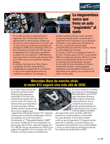 35NOVEDADESEn su af%u00e1n por llevar la seguridad vial al siguiente nivel, la firma sueca Autoliv ha desarrollado un revolucionario sistema de frenado por vac%u00edo llamado freno Torricelli, que se activa junto con la frenada autom%u00e1tica de emergencia (AEB). Esta tecnolog%u00eda utiliza una placa ubicada en los bajos del veh%u00edculo que se despliega en 0,1 segundos y se adhiere al asfalto con una fuerza de 15.000 Newtons, logrando reducir la distancia de frenado hasta en un 40%, incluso en superficies mojadas o heladas.El sistema, inspirado en el f%u00edsico italiano Evangelista Torricelli, act%u00faa de forma independiente al agarre de los neum%u00e1ticos, lo que lo hace especialmente eficaz en condiciones adversas. Sin embargo, su potencia extrema plantea nuevos desaf%u00edos: su fuerza es tal que podr%u00eda comprometer la seguridad de los ocupantes si no se refuerzan cinturones y otros elementos del habit%u00e1culo. Por ello, su aplicaci%u00f3n est%u00e1 pensada principalmente para entornos urbanos, donde las velocidades son menores.En Europa, la AEB ya es obligatoria hasta los 60 km/h, mientras que en EE.UU. lo ser%u00e1 desde 2029 con exigencias de hasta 100 km/h, lo que limita la compatibilidad del freno Torricelli en contextos de alta velocidad. Aunque a%u00fan no est%u00e1 listo para la producci%u00f3n masiva, el desarrollo de esta %u201cventosa gigante%u201d representa una prometedora innovaci%u00f3n en seguridad activa urbana, con el potencial de salvar muchas vidas.La megaventosa sueca que frena un auto %u201cpeg%u00e1ndolo%u201d al sueloEn el Sal%u00f3n Internacional del Autom%u00f3vil de M%u00fanich (IAA Mobility), Mercedes-Benz sorprendi%u00f3 al anunciar que mantendr%u00e1 en producci%u00f3n su ic%u00f3nico motor V12, pese a las restricciones que impondr%u00e1 la normativa europea. Markus Sch%u00e4fer, director de tecnolog%u00eda de la marca, asegur%u00f3 que %u201cseguiremos ofreciendo motores V12%u201d, dejando entrever que la compa%u00f1%u00eda trabaja para hacerlos compatibles con la normativa Euro 7.Actualmente, el **Mercedes-Maybach S 680** es el %u00fanico modelo de la marca equipado con este bloque de 6.0 litros, capaz de entregar 612 CV y 900 Nm de par, alcanzando los 100 km/h en apenas 4,5 segundos, con un consumo de 13,4 l/100 km. Su precio parte en 276.539 euros.El anuncio supone un cambio de rumbo en la estrategia de Mercedes-Benz, que en 2021 hab%u00eda declarado que para 2030 vender%u00eda %u00fanicamente coches el%u00e9ctricos. Hoy, la compa%u00f1%u00eda reconoce que apostar exclusivamente por la electrificaci%u00f3n fue un error, mientras algunos modelos de la gama EQ, como los EQE y EQE SUV, podr%u00edan ver comprometida su continuidad.Con esta decisi%u00f3n, la firma de la estrella confirma que el legendario V12 seguir%u00e1 siendo parte de su cat%u00e1logo, ya sea en Europa o en mercados menos estrictos como Oriente Medio y China, al menos hasta la prohibici%u00f3n total de los motores de combusti%u00f3n en 2035.Mercedes-Benz da marcha atr%u00e1s: el motor V12 seguir%u00e1 vivo m%u00e1s all%u00e1 de 2030