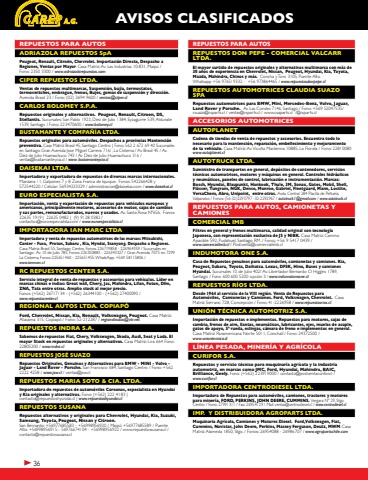 36AVISOS CLASIFICADOSREPUESTOS PARA AUTOSREPUESTOS DON PEPE - COMERCIAL VALCARR LTDA.El mayor surtido de repuestos originales y alternativos multimarca con m%u00e1s de 30 a%u00f1os de experiencia en Chevrolet, Nissan, Peugeot, Hyundai, Kia, Toyota, Mazda, Mahindra, Chinos y m%u00e1s. Concha y Toro 3105, Puente Alto. Whatsapp +56 976519332 - +56 973864465 / www.repuestosdonpepe.clREPUESTOS AUTOMOTRICES CLAUDIA SUAZO SPARepuestos automotrices para BMW, Mini, Mercedes-Benz, Volvo, Jaguar, Land Rover y Porsche. Av Las Condes 7146, Santiago / Fono: +569 52047535/ csuazo@csparts.cl / ventas@csparts.cl / www.csaparts.cl /@csparts.clACCESORIOS AUTOMOTRICESAUTOPLANETCadena de tiendas de venta de repuestos y accesorios. Encuentra todo lo necesario para la mantenci%u00f3n, reparaci%u00f3n, embellecimiento y mejoramiento de tu veh%u00edculo. Casa Matriz: Av. Vicu%u00f1a Mackenna 10885, La Florida / Fono: 22810080 www.autoplanet.clAUTOTRUCK LTDA.Suministro de transportes en general, dep%u00f3sitos de contenedores, servicios t%u00e9cnicos automotrices, motores y m%u00e1quinas en general. Controles hidr%u00e1ulicos y neum%u00e1ticos, paneles de control, lubricaci%u00f3n e instrumentaci%u00f3n. Marcas: Bosch, Hyundai, Blaupunkt, Hankook, Thule, 3M, Sonax, Gates, Mobil, Shell, Fl%u00f6sser, Tungram, NGK, Denso, Monroe, Gabriel, Fleetguard, Mann, Loctite, VersaChem, Abro, Unipoint, entre otras. Avda. Central 284 Placilla de Pe%u00f1uela, Valpara%u00edso / Fonos: (56-32)2293797 -32-2292967 / autotruck1@gmail.com / www.autotruck.clREPUESTOS PARA AUTOS, CAMIONETAS Y CAMIONESCOMERCIAL IMBFiltros en general y frenos multimarca, calidad original con tecnolog%u00eda Japonesa, con representaci%u00f3n exclusiva de JS y NIBK. Casa Matriz: Camino Apacible 592, Pudahuel, Santiago RM. / Fono%u00a1: +56 9 5417 0439 / www.comercialimb.cl / Postventa@comercialimb.clINDUMOTORA ONE S.A.Casa de Repuestos genuinos para autom%u00f3viles, camionetas y camiones. Kia, Peugeot, Subaru, Toyota, Daihatsu. Lexus, DFSK, Hino, Buses y camiones Hyundai. Sucursales 10 de Julio 402/ Av. Libertador Bernardo O Higgins 1789, Santiago / Fono 600 600 5200 opci%u00f3n 3 / www.indumotoraone.clREPUESTOS R%u00cdOS LTDA.Desde 1964 al servicio de la VIII regi%u00f3n. Venta de Repuestos para Autom%u00f3viles, Camionetas y Camiones. Ford, Volkswagen, Chevrolet. Casa Matriz: Serrano 728, Concepci%u00f3n / Fono: 41-2226958 / www.repuestosrios.clUNI%u00d3N T%u00c9CNICA AUTOMOTRIZ S.A.Importaci%u00f3n de repuestos e implementos. Repuestos para motores, cajas de cambio, frenos de aire, llantas, neum%u00e1ticos, lubricantes, ejes, muelas de acople, gatos de apoyo, 5%u00aa rueda, eslingas, c%u00e1mara de freno e implementos en general.Casa Matriz: Panamericana Norte 5011, Conchal%u00ed / Fono: 24372500 / www.uniontecnica.dL%u00cdNEA PESADA, MINER%u00cdA Y AGR%u00cdCOLACURIFOR S.A.Repuestos y servicio t%u00e9cnico para maquinar%u00eda agr%u00edcola y la industria automotriz, en marcas como JMC, Ford, Hyundai, Mahindra, BAIC, Brilliance, Geely. Fono: (+562) 223919000 / contacto@postventacurifor.cl / www.curifor.clIMPORTADORA CENTRODIESEL LTDA.Importadora de Repuestos para autom%u00f3viles, camiones, tractores y motores para miner%u00eda, FORD, PERKINS, JOHN DEERE, CUMMINS. Vergara N%u00ba 29, Stgo. Centro / Fono: 27991311 / Fax: 26954129 / Mail: ventas@centrodiesel.cl / www.centrodiesel.clIMP. Y DISTRIBUIDORA AGROPARTS LTDA.Maquinaria Agr%u00edcola, Camiones y Motores Diesel. Ford,Volkswagen, Fiat, Cummins, Navistar, John Deere, Perkins, Massey Ferguson, Deutz, MWM. Casa Matriz: Alameda 1850, Stgo. / Fonos: 26954088 - 26986707 / www.agropartschile.comREPUESTOS PARA AUTOSADRIAZOLA REPUESTOS SpAPeugeot, Renault, Citro%u00ebn, Chevrolet. Importaci%u00f3n Directa, Despacho a Regiones, Ventas por Mayor. Casa Matriz: Av. Las Industrias 10.831, Maip%u00fa / Fono: 2350 3300 / www.adriazolarepuestos.comCIPER REPUESTOS LTDA.Ventas de repuestos multimarcas, Suspensi%u00f3n, buj%u00eda, termostatos, termoswitches, embrague, frenos, Bujes, gomas de suspensi%u00f3n y direcci%u00f3n.Avenida Brasil 23 / Fono: (02) 2694 9600 / ventas@ciper.clCARLOS BOLOMEY S.P.A.Repuestos originales y alternativos. Peugeot, Renault, Citroen, DS, Stellantis. Sucursales: San Pablo 1923, Diez de Julio 1384, Eyzaguirre 539, Aldunate 1539, Santiago / Fono: 223470600 / www.bolomey.clBUSTAMANTE Y COMPA%u00d1%u00cdA LTDA.Repuestos originales para autom%u00f3viles. Despachos a provincias Mantenci%u00f3n preventiva. Casa Matriz Brasil 45, Santiago Centro | Fono: 562 2 672 69 40 Sucursales en Santiago: Gran Avenida Jose Miguel Carrera 7161, La Cisterna / Av Brasil 45 / Av. Diez de Julio Huamachuco 743 / Av Diez de Julio Huamachuco 316 / ventas@bustamanteycia.cl / www. bustamanteycia.clDAISEKAI LTDA.Importadora y exportadora de repuestos de diversas marcas internacionales. Manzana 11, Galpones 7 y 8 Zona Franca de Iquique. Fonos: 542266428 y 572544220 / Celular: 56934233329 / administracion@daisekai.com / www.daisekai.clEURO ESPECIALISTA S.A.Importaci%u00f3n, venta y exportaci%u00f3n de repuestos para veh%u00edculos europeos y americanos, principalmente motores, accesorios de motor, cajas de cambios y sus partes, remanufacturados, nuevos y usados. Av. Santa Rosa N%u00ba656. Fonos: 22635 1919 | 22635 0482 | (9) 9128 0382 / contactos@euroespecialista.com / www.euroespecialista.clIMPORTADORA IAN MARC LTDAImportadora y venta de repuestos automotrices de las marcas: Mitsubishi, Canter - Fuso, Proton, Subaru , Kia, Hyndai, Ssanyong. Despacho a Regiones. Casa Matriz: Brasil 55, Santiago Centro, Fonos: 226719858 - 226964359 / Sucursales en Santiago: Av. 10 de Julio 785, Fonos: 226350883 - 226343327 / Gran Avenida 7075 ex 7299 La Cisterna, Fonos: 225651460 - 225651455. WhatsApp: +569 58115806 / www.ianmarc.clRC REPUESTOS CENTER S.A.Servicio integral de venta de repuestos y accesorios para veh%u00edculos. L%u00edder en marcas chinas e indias: Great wall, Chery, Jac, Mahindra, Lifan, Foton, Dfm, ZNA, Tata entre otr