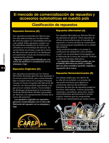 6GREMIORepuestos Genuinos (G)Son repuestos producidos por fabricas que han sido seleccionadas por los fabricantes de veh%u00edculos seg%u00fan sus necesidades t%u00e9cnicas y de calidad. Estos repuestos cumplen con los est%u00e1ndares exigidos por la marca y son utilizados en el ensamblaje del veh%u00edculo. Se comercializan en envases y logo de la marca del fabricante del autom%u00f3vil y se distribuyen principalmente a trav%u00e9s de concesionarios y representantes oficiales.- Repuesto original comercializado por una marca de autom%u00f3vil o concesionario con su empaque y logo.Repuestos Originales (O)Son repuestos producidos por los mismos fabricantes de piezas genuinas que abastecen a las marcas automotrices, pero comercializados bajo su propia marca con su propio empaque. Aunque no llevan el logotipo del fabricante del veh%u00edculo, son t%u00e9cnicamente equivalentes a los genuinos en calidad, dise%u00f1o y funcionalidad. Se distribuyen directamente en el mercado a trav%u00e9s de distribuidores oficiales que pueden ser distintos a los representantes oficiales de la marca del autom%u00f3vil%u00a0%u00a0- Los repuestos originales son repuestos genuinos comercializados con la marca del fabricante del repuesto con su empaque y logo.Repuestos Aftermarket (A)Son aquellos fabricados por distintas f%u00e1bricas de repuestos en general . Estos repuestos se utilizan exclusivamente para el mercado de reposici%u00f3n y muchos de ellos se comercializan con marcas propias respaldando as%u00ed la calidad del producto.Estos productos pueden o no poseer la certificaci%u00f3n de calidad ISO como tambi%u00e9n cumplir con los est%u00e1ndares homologados por el fabricante de la marca del veh%u00edculo. Tambi%u00e9n pueden ser llamados alternativos - Los repuestos Aftermarket pueden ser una excelente alternativa en precio y calidad, pero es clave considerar garant%u00eda, respaldo y reputaci%u00f3n de la marca.Repuestos Remanufacturados (R)Son piezas usadas que, a%u00fan dentro de su vida %u00fatil, se someten a un proceso de reacondicionamiento para dejarlas en condiciones %u00f3ptimas de reutilizaci%u00f3n. Ejemplos de este tipo de repuestos podemos encontrar alternadores, motores de partida, inyectores y cremalleras, entre otros. Suelen remanufacturarse aprovechando la carcasa original, mientras que los componentes internos son reemplazados por piezas nuevas.El mercado de comercializaci%u00f3n de repuestos y accesorios automotrices en nuestro pa%u00edsC%u00e1mara Chilena de Comercio de Repuestos y Accesorios AutomotricesClasificaci%u00f3n de repuestos