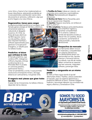 9FRENOScomo Volvo y Scania lo han implementado en buses interurbanos, reduciendo accidentes en cruces peatonales y planteando nuevos retos de posventa en sensores y calibraci%u00f3n, algo que pronto llegar%u00e1 a las rutas chilenas.Regenerativo: frenar para cargarLa electromovilidad transform%u00f3 el concepto: cada frenada genera energ%u00eda en h%u00edbridos y el%u00e9ctricos, alimentando bater%u00edas y reduciendo el desgaste mec%u00e1nico. En Chile, las flotas de buses el%u00e9ctricos de RED reportan menor uso de pastillas y discos, pero requieren bombas y software especializados para gestionar la recuperaci%u00f3n energ%u00e9tica, un desaf%u00edo para los talleres locales.Predictivo: el futuro que anticipa la rutaEl frenado predictivo, que combina GPS, inteligencia artificial y big data, anticipa condiciones de la v%u00eda. Mercedes-Benz lo prueba en camiones pesados, optimizando frenos y motor en pendientes y curvas, lo que promete revolucionar el transporte minero y de larga distancia en Latinoam%u00e9rica, incluyendo Chile.El negocio real: piezas que giran todos los d%u00edasA pesar de las innovaciones, los talleres chilenos dependen de los cl%u00e1sicos:I. Pastillas de freno: L%u00edderes en rotaci%u00f3n, con materiales como cer%u00e1micos y semimet%u00e1licos.2. Discos: Reemplazados por desgaste o vibraciones.3. Bombas de freno: Menos frecuentes, pero clave en reparaciones integrales.4. L%u00edquidos: Negocio recurrente, con %u00e9nfasis en DOT 4 y DOT 5.1.5. Kits completos: Tendencia entre distribuidores para simplificar log%u00edstica y garantizar compatibilidad.Par lo anterior, cadenas o tiendas de repuestos locales ya ofrecen kits con pastillas, discos y accesorios, aumentando el ticket promedio y reduciendo devoluciones.Perspectiva de mercadoLos fabricantes deben innovar en materiales y compatibilidad con sistemas electr%u00f3nicos. Los distribuidores tienen una oportunidad con kits, l%u00edquidos premium y formaci%u00f3n t%u00e9cnica. Los talleres, m%u00e1s all%u00e1 de instalar, deben convertirse en asesores que lean sensores, interpreten software y prevengan fallas.Tradici%u00f3n y vanguardia en un mismo pedalEn 2025, el freno sigue siendo el eje del aftermarket chileno. Pastillas y discos sostendr%u00e1n el mercado, pero los sistemas electr%u00f3nicos y predictivos definir%u00e1n el futuro. Quienes integren tradici%u00f3n y tecnolog%u00eda liderar%u00e1n una movilidad m%u00e1s segura, el%u00e9ctrica y conectada en Chile.