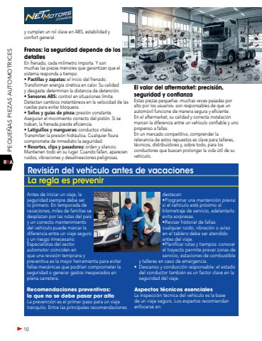 10PEQUE%u00d1AS PIEZAS AUTOMOTRICESy cumplen un rol clave en ABS, estabilidad y confort general.Frenos: la seguridad depende de los detallesEn frenado, cada mil%u00edmetro importa. Y son muchas las piezas menores que garantizan que el sistema responda a tiempo.%u2022 Pastillas y zapatas: el inicio del frenado.Transforman energ%u00eda cin%u00e9tica en calor. Su calidad y desgaste determinan la distancia de detenci%u00f3n.%u2022 Sensores ABS: control en situaciones l%u00edmite.Detectan cambios instant%u00e1neos en la velocidad de las ruedas para evitar bloqueos.%u2022 Sellos y gu%u00edas de pinza: presi%u00f3n constante.Aseguran el movimiento correcto del pist%u00f3n. Si se traban, la frenada pierde eficiencia.%u2022 Latiguillos y mangueras: conductos vitales.Transmiten la presi%u00f3n hidr%u00e1ulica. Cualquier fisura compromete de inmediato la seguridad.%u2022 Resortes, clips y pasadores: orden y silencio.Mantienen todo en su lugar. Cuando fallan, aparecen ruidos, vibraciones y desalineaciones peligrosas.El valor del aftermarket: precisi%u00f3n, seguridad y confianzaEstas piezas peque%u00f1as -muchas veces pasadas por alto por los usuarios- son responsables de que un autom%u00f3vil funcione de manera segura y eficiente. En el aftermarket, su calidad y correcta instalaci%u00f3n marcan la diferencia entre un veh%u00edculo confiable y uno propenso a fallas.En un mercado competitivo, comprender la relevancia de estos repuestos es clave para talleres, t%u00e9cnicos, distribuidores y, sobre todo, para los conductores que buscan prolongar la vida %u00fatil de su veh%u00edculo.Antes de iniciar un viaje, la seguridad siempre debe ser lo primero. En temporada de vacaciones, miles de familias se desplazan por las rutas del pa%u00eds y un correcto mantenimiento del veh%u00edculo puede marcar la diferencia entre un viaje seguro y un riesgo innecesario. Especialistas del sector automotor coinciden en que una revisi%u00f3n temprana y preventiva es la mejor herramienta para evitar fallas mec%u00e1nicas que podr%u00edan comprometer la seguridad o generar gastos inesperados en plena carretera.Recomendaciones preventivas: lo que no se debe pasar por altoLa prevenci%u00f3n es el primer paso para un viaje tranquilo. Entre las principales recomendaciones destacan:%u2022Programar una mantenci%u00f3n previa: si el veh%u00edculo est%u00e1 pr%u00f3ximo al kilometraje de servicio, adelantarlo evita sorpresas.%u2022Revisar historial de fallas: cualquier ruido, vibraci%u00f3n o aviso en el tablero debe ser atendido antes del viaje.%u2022Planificar rutas y tiempos: conocer el trayecto permite prever zonas de servicio, estaciones de combustible y talleres en caso de emergencia.%u2022 Descanso y conducci%u00f3n responsable: el estado del conductor tambi%u00e9n es un factor clave en la seguridad del viaje.Aspectos t%u00e9cnicos esencialesLa inspecci%u00f3n t%u00e9cnica del veh%u00edculo es la base de un viaje seguro. Los expertos recomiendan enfocarse en:Revisi%u00f3n del veh%u00edculo antes de vacacionesLa regla es prevenir