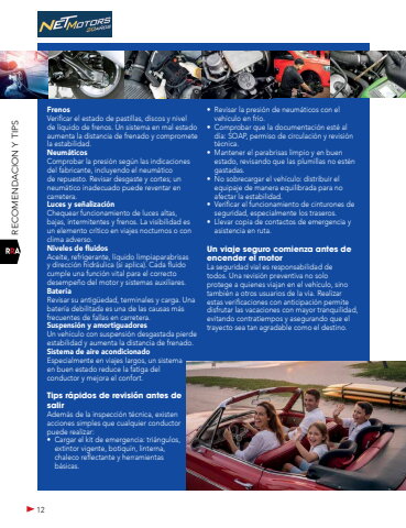 12RECOMENDACION Y TIPSFrenosVerificar el estado de pastillas, discos y nivel de l%u00edquido de frenos. Un sistema en mal estado aumenta la distancia de frenado y compromete la estabilidad.Neum%u00e1ticosComprobar la presi%u00f3n seg%u00fan las indicaciones del fabricante, incluyendo el neum%u00e1tico de repuesto. Revisar desgaste y cortes; un neum%u00e1tico inadecuado puede reventar en carretera.Luces y se%u00f1alizaci%u00f3nChequear funcionamiento de luces altas, bajas, intermitentes y frenos. La visibilidad es un elemento cr%u00edtico en viajes nocturnos o con clima adverso.Niveles de fluidosAceite, refrigerante, l%u00edquido limpiaparabrisas y direcci%u00f3n hidr%u00e1ulica (si aplica). Cada fluido cumple una funci%u00f3n vital para el correcto desempe%u00f1o del motor y sistemas auxiliares.Bater%u00edaRevisar su antig%u00fcedad, terminales y carga. Una bater%u00eda debilitada es una de las causas m%u00e1s frecuentes de fallas en carretera.Suspensi%u00f3n y amortiguadoresUn veh%u00edculo con suspensi%u00f3n desgastada pierde estabilidad y aumenta la distancia de frenado.Sistema de aire acondicionadoEspecialmente en viajes largos, un sistema en buen estado reduce la fatiga del conductor y mejora el confort.Tips r%u00e1pidos de revisi%u00f3n antes de salirAdem%u00e1s de la inspecci%u00f3n t%u00e9cnica, existen acciones simples que cualquier conductor puede realizar:%u2022 Cargar el kit de emergencia: tri%u00e1ngulos, extintor vigente, botiqu%u00edn, linterna, chaleco reflectante y herramientas b%u00e1sicas.%u2022 Revisar la presi%u00f3n de neum%u00e1ticos con el veh%u00edculo en fr%u00edo.%u2022 Comprobar que la documentaci%u00f3n est%u00e9 al d%u00eda: SOAP, permiso de circulaci%u00f3n y revisi%u00f3n t%u00e9cnica.%u2022 Mantener el parabrisas limpio y en buen estado, revisando que las plumillas no est%u00e9n gastadas.%u2022 No sobrecargar el veh%u00edculo: distribuir el equipaje de manera equilibrada para no afectar la estabilidad.%u2022 Verificar el funcionamiento de cinturones de seguridad, especialmente los traseros.%u2022 Llevar copia de contactos de emergencia y asistencia en ruta.Un viaje seguro comienza antes de encender el motorLa seguridad vial es responsabilidad de todos. Una revisi%u00f3n preventiva no solo protege a quienes viajan en el veh%u00edculo, sino tambi%u00e9n a otros usuarios de la v%u00eda. Realizar estas verificaciones con anticipaci%u00f3n permite disfrutar las vacaciones con mayor tranquilidad, evitando contratiempos y asegurando que el trayecto sea tan agradable como el destino.