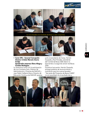 19GREMIO%u2022 Caren SPA %u2013 Sucursal Concepci%u00f3nAlumno:%u00a0Cristian Marcelo Osorio Armijo Apoderadas empresa:%u00a0Elena Aliaga y Carolina Rodr%u00edguez.La ceremonia cont%u00f3 con la participaci%u00f3n de Luis Contreras Soto, Director de Administraci%u00f3n y Finanzas de INACAP y Juan Pablo Calder%u00f3n Bravo, Director de Educaci%u00f3n Continua de INACAP, quienes junto al presidente de Carep, Hern%u00e1n Quezada y Ra%u00fal Paredes, presidente del Comit%u00e9 de Becas 2026 dieron la bienvenida a la segunda versi%u00f3n de Becas 2026.Durante el encuentro, Hern%u00e1n Quezada, entreg%u00f3 palabras de reconocimiento y motivaci%u00f3n para los nuevos becados. %u201cSer parte del Programa de Becas CAREP no es casualidad: es el resultado de su Los cinco becados en el momento de firmar su carta compromiso.