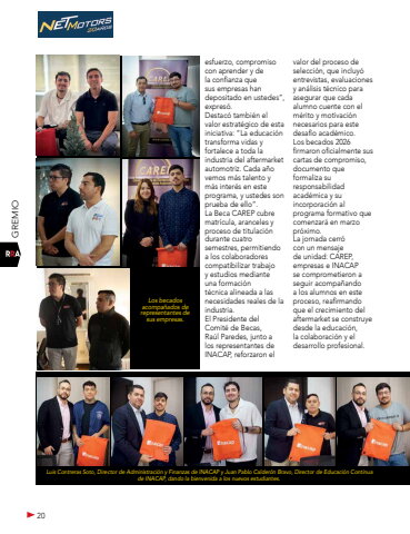 20GREMIOesfuerzo, compromiso con aprender y de la confianza que sus empresas han depositado en ustedes%u201d, expres%u00f3.Destac%u00f3 tambi%u00e9n el valor estrat%u00e9gico de esta iniciativa: %u201cLa educaci%u00f3n transforma vidas y fortalece a toda la industria del aftermarket automotriz. Cada a%u00f1o vemos m%u00e1s talento y m%u00e1s inter%u00e9s en este programa, y ustedes son prueba de ello%u201d.La Beca CAREP cubre matr%u00edcula, aranceles y proceso de titulaci%u00f3n durante cuatro semestres, permitiendo a los colaboradores compatibilizar trabajo y estudios mediante una formaci%u00f3n t%u00e9cnica alineada a las necesidades reales de la industria.El Presidente del Comit%u00e9 de Becas, Ra%u00fal Paredes, junto a los representantes de INACAP, reforzaron el valor del proceso de selecci%u00f3n, que incluy%u00f3 entrevistas, evaluaciones y an%u00e1lisis t%u00e9cnico para asegurar que cada alumno cuente con el m%u00e9rito y motivaci%u00f3n necesarios para este desaf%u00edo acad%u00e9mico.Los becados 2026 firmaron oficialmente sus cartas de compromiso, documento que formaliza su responsabilidad acad%u00e9mica y su incorporaci%u00f3n al programa formativo que comenzar%u00e1 en marzo pr%u00f3ximo.La jornada cerr%u00f3 con un mensaje de unidad: CAREP, empresas e INACAP se comprometieron a seguir acompa%u00f1ando a los alumnos en este proceso, reafirmando que el crecimiento del aftermarket se construye desde la educaci%u00f3n, la colaboraci%u00f3n y el desarrollo profesional.Los becados acompa%u00f1ados de representantes de sus empresas. Luis Contreras Soto, Director de Administraci%u00f3n y Finanzas de INACAP y Juan Pablo Calder%u00f3n Bravo, Director de Educaci%u00f3n Continua de INACAP, dando la bienvenida a los nuevos estudiantes.