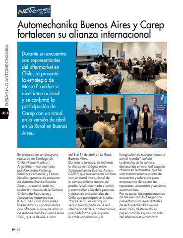 22DESAYUNO AUTOMECHANIKAEn el marco de un desayuno realizado en Santiago de Chile, Messe Frankfurt Argentina %u2014representada por Alexandra Pacheco, directora comercial, y Fabi%u00e1n Natalini, gerente de proyecto de Automechanika Buenos Aires%u2014 present%u00f3 ante los socios e invitados de la C%u00e1mara Chilena de Repuestos y Accesorios Automotrices (CAREP A.G.) los principales lineamientos y oportunidades que ofrecer%u00e1 la pr%u00f3xima edici%u00f3n de Automechanika Buenos Aires 2026, que se llevar%u00e1 a cabo del 8 al 11 de abril en La Rural, Buenos Aires.Durante la jornada, se reafirm%u00f3 la alianza estrat%u00e9gica entre Automechanika Buenos Aires y CAREP, que nuevamente contar%u00e1 con un stand institucional de la c%u00e1mara chilena dentro del predio ferial, destinado a recibir y acompa%u00f1ar a las delegaciones y visitantes profesionales de Chile que participen en la feria. %u201cPara CAREP es un orgullo seguir siendo parte de la red internacional de Automechanika, una plataforma que impulsa la profesionalizaci%u00f3n y la integraci%u00f3n de nuestra industria con el mundo%u201d, se%u00f1al%u00f3 la directiva de la c%u00e1mara, destacando el valor del espacio chileno en la muestra, que ha sido hist%u00f3ricamente punto de encuentro y referencia para empresarios del sector de repuestos, accesorios y servicios automotrices.Por su parte, los representantes de Messe Frankfurt Argentina presentaron los ejes centrales de Automechanika Buenos Aires 2026, destacando su papel como la exposici%u00f3n l%u00edder del aftermarket automotriz Automechanika Buenos Aires y Carep fortalecen su alianza internacionalDurante un encuentro con representantes del aftermarket en Chile, se present%u00f3 la estrategia de Messe Frankfurt a nivel internacional y se confirm%u00f3 la participaci%u00f3n de Carep con un stand en la versi%u00f3n de abril en La Rural en Buenos Aires.