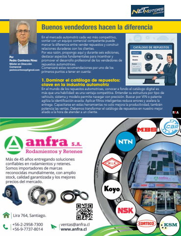 27Por Pedro Contreras P%u00e9rez M%u00e1ster en Direcci%u00f3n Comercialpedroicontrerasp@gmail.comEn el mercado automotriz cada vez m%u00e1s competitivo, contar con un equipo comercial competente puede marcar la diferencia entre vender repuestos y construir relaciones duraderas con los clientes.Por esa raz%u00f3n, propongo aqu%u00ed y durante seis ediciones, destacar aspectos fundamentales para incentivar y promover el desarrollo profesional de los vendedores de repuestos automotrices.Comenzar%u00e9 estas recomendaciones por uno de los primeros puntos a tener en cuenta:1. Dominar el cat%u00e1logo de repuestos: clave en la industria automotrizEn el mundo de los repuestos automotrices, conocer a fondo el cat%u00e1logo digital es m%u00e1s que una habilidad: es una ventaja competitiva. Entender su estructura por tipo de veh%u00edculo, sistema y modelo permite navegar con precisi%u00f3n. Buscar por VIN o patente agiliza la identificaci%u00f3n exacta. Aplicar filtros inteligentes reduce errores y acelera la entrega. Capacitarse en estas herramientas no solo mejora la productividad, tambi%u00e9n potencia las ventas. Debemos transformar el cat%u00e1logo de repuestos en nuestro mejor aliado a la hora de atender a un cliente.Buenos vendedores hacen la diferencia