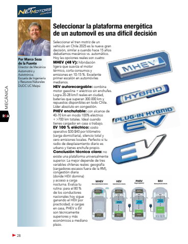 28MEC%u00c1NICAPor Marco Soza de la FuenteDirector de Mec%u00e1nica Automotriz y Autotr%u00f3nica.Escuela de Ingenier%u00eda y Recursos NaturalesDUOC UC Maip%u00faSeleccionar el tren motriz de un veh%u00edculo en Chile 2025 es la nueva gran decisi%u00f3n, similar a cuando hace 15 a%u00f1os debat%u00edamos mec%u00e1nico vs. autom%u00e1tico.Hoy las opciones reales son cuatro:MHEV (48 V): hibridaci%u00f3n ligera que suaviza el motor t%u00e9rmico, corta consumos y emisiones en 10-15 %. Excelente primer escal%u00f3n en autom%u00f3viles medianos.HEV autorecargable: combina motor gasolina + el%u00e9ctrico sin enchufes. Logra 20-28 km/l reales en ciudad, bater%u00edas que superan 300.000 km y repuestos disponibles en todo Chile. L%u00edder absoluto en congesti%u00f3n.PHEV enchufable: con alcance de 40-70 km en modo 100% el%u00e9ctrico + >700 km totales. Ideal cuando tienes cargador en casa o trabajo.EV 100 % el%u00e9ctrico: costo operativo $30-$40 por kil%u00f3metro (carga domiciliaria), silencio total y cero emisiones locales. Perfecto si tu radio de desplazamiento diario es urbano y tienes enchufe propio. Conclusi%u00f3n t%u00e9cnica clara: no existe una plataforma universalmente superior. La mejor depende de tres variables chilenas reales: geograf%u00eda (cargadores escasos fuera de la RM), congesti%u00f3n diaria (donde HEV domina) y acceso a carga nocturna. Eval%u00faa tu rutina: para el 80 % de los conductores nacionales hoy sigue ganando el HEV por practicidad; si cargas en casa, PHEV o EV son t%u00e9cnicamente superiores y m%u00e1s econ%u00f3micos a mediano plazo.Seleccionar la plataforma energ%u00e9tica de un automovil es una dif%u00edcil decisi%u00f3n