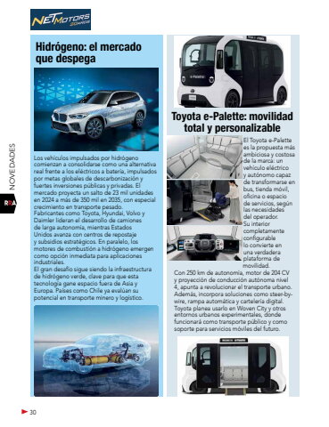 30NOVEDADESLos veh%u00edculos impulsados por hidr%u00f3geno comienzan a consolidarse como una alternativa real frente a los el%u00e9ctricos a bater%u00eda, impulsados por metas globales de descarbonizaci%u00f3n y fuertes inversiones p%u00fablicas y privadas. El mercado proyecta un salto de 23 mil unidades en 2024 a m%u00e1s de 350 mil en 2035, con especial crecimiento en transporte pesado.Fabricantes como Toyota, Hyundai, Volvo y Daimler lideran el desarrollo de camiones de larga autonom%u00eda, mientras Estados Unidos avanza con centros de repostaje y subsidios estrat%u00e9gicos. En paralelo, los motores de combusti%u00f3n a hidr%u00f3geno emergen como opci%u00f3n inmediata para aplicaciones industriales.El gran desaf%u00edo sigue siendo la infraestructura de hidr%u00f3geno verde, clave para que esta tecnolog%u00eda gane espacio fuera de Asia y Europa. Pa%u00edses como Chile ya eval%u00faan su potencial en transporte minero y log%u00edstico.Hidr%u00f3geno: el mercado que despegaEl Toyota e-Palette es la propuesta m%u00e1s ambiciosa y costosa de la marca: un veh%u00edculo el%u00e9ctrico y aut%u00f3nomo capaz de transformarse en bus, tienda m%u00f3vil, oficina o espacio de servicios, seg%u00fan las necesidades del operador. Su interior completamente configurable lo convierte en una verdadera plataforma de movilidad.Con 250 km de autonom%u00eda, motor de 204 CV y proyecci%u00f3n de conducci%u00f3n aut%u00f3noma nivel 4, apunta a revolucionar el transporte urbano. Adem%u00e1s, incorpora soluciones como steer-bywire, rampa autom%u00e1tica y carteler%u00eda digital.Toyota planea usarlo en Woven City y otros entornos urbanos experimentales, donde funcionar%u00e1 como transporte p%u00fablico y como soporte para servicios m%u00f3viles del futuro.Toyota e-Palette: movilidad total y personalizable