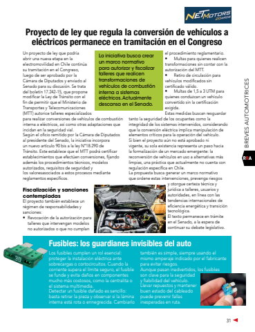 31BREVES AUTOMOTRICESUn proyecto de ley que podr%u00eda abrir una nueva etapa en la electromovilidad en Chile contin%u00faa su tramitaci%u00f3n en el Congreso, luego de ser aprobado por la C%u00e1mara de Diputados y enviado al Senado para su discusi%u00f3n. Se trata del bolet%u00edn 17.242-15, que propone modificar la Ley de Tr%u00e1nsito con el fin de permitir que el Ministerio de Transportes y Telecomunicaciones (MTT) autorice talleres especializados para realizar conversiones de veh%u00edculos de combusti%u00f3n interna a el%u00e9ctricos, as%u00ed como otras adaptaciones que incidan en la seguridad vial.Seg%u00fan el oficio remitido por la C%u00e1mara de Diputados al presidente del Senado, la iniciativa incorpora un nuevo art%u00edculo 90 bis a la ley N%u00b018.290 de Tr%u00e1nsito. Este establece que el MTT podr%u00e1 certificar establecimientos que efect%u00faen conversiones, fijando adem%u00e1s los procedimientos t%u00e9cnicos, modelos autorizados, requisitos de seguridad y los valoresasociados a estos procesos mediante reglamentos espec%u00edficos.Fiscalizaci%u00f3n y sanciones contempladasEl proyecto tambi%u00e9n establece un r%u00e9gimen de responsabilidades y sanciones:%u2022 Revocaci%u00f3n de la autorizaci%u00f3n para talleres que intervengan modelos no autorizados o que no cumplan el procedimiento reglamentario.%u2022 Multas para quienes realicen transformaciones sin contar con la autorizaci%u00f3n del MTT.%u2022 Retiro de circulaci%u00f3n para veh%u00edculos modificados sin certificado v%u00e1lido.%u2022 Multas de 1,5 a 3 UTM para quienes conduzcan un veh%u00edculo convertido sin la certificaci%u00f3n exigida.Estas medidas buscan resguardar tanto la seguridad de los ocupantes como la integridad de los sistemas intervenidos, considerando que la conversi%u00f3n el%u00e9ctrica implica manipulaci%u00f3n de elementos cr%u00edticos para la operaci%u00f3n del veh%u00edculo.Si bien el proyecto a%u00fan no est%u00e1 aprobado ni vigente, su sola existencia representa un paso hacia la formalizaci%u00f3n de un mercado emergente: la reconversi%u00f3n de veh%u00edculos en uso a alternativas m%u00e1s limpias, una pr%u00e1ctica que actualmente no cuenta con regulaci%u00f3n espec%u00edfica en Chile.La propuesta busca generar un marco normativo que ordene estas intervenciones, prevenga riesgos y otorgue certeza t%u00e9cnica y jur%u00eddica a talleres, usuarios y autoridades, en l%u00ednea con las tendencias internacionales de eficiencia energ%u00e9tica y transici%u00f3n tecnol%u00f3gica.El texto permanece en tr%u00e1mite en el Senado, a la espera de continuar su debate legislativo.Proyecto de ley que regula la conversi%u00f3n de veh%u00edculos a el%u00e9ctricos permanece en tramitaci%u00f3n en el CongresoLa iniciativa busca crear un marco normativo para autorizar y fiscalizar talleres que realicen transformaciones de veh%u00edculos de combusti%u00f3n interna a sistemas el%u00e9ctricos. Actualmente descansa en el Senado.Fusibles: los guardianes invisibles del autoLos fusibles cumplen un rol esencial: proteger la instalaci%u00f3n el%u00e9ctrica ante sobrecargas o cortocircuitos. Cuando la corriente supera el l%u00edmite seguro, el fusible se funde y evita da%u00f1os en componentes mucho m%u00e1s costosos, como la centralita o el sistema multimedia.Detectar un fusible da%u00f1ado es sencillo: basta retirar la pieza y observar si la l%u00e1mina interna est%u00e1 rota o ennegrecida. Cambiarlo tambi%u00e9n es simple, siempre usando el mismo amperaje indicado por el fabricante para evitar riesgos.Aunque pasan inadvertidos, los fusibles son clave para la seguridad y fiabilidad del veh%u00edculo. Llevar repuestos y mantener buen estado del cableado puede prevenir fallas inesperadas en ruta.