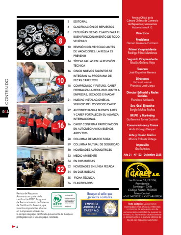 4CONTENIDORevista Oficial de la C%u00e1mara Chilena de Comercio de Repuestos y Accesorios Automotrices A. G.DirectorioPresidenteHern%u00e1n Quezada H%u00f6rmannPrimer VicepresidenteRodrigo P%u00e9rez MardonesSegundo VicepresidenteNicol%u00e1s Gellona ViejoTesoreroJos%u00e9 Riquelme HerreraDirectoresPatricio Guzm%u00e1nFrancisco Jos%u00e9 JarpaDirector Editorial y Redes SocialesFrancisco AdriazolaSec. Gral. EjecutivoSergio Mu%u00f1oz Mu%u00f1ozRR.PP. y MarketingGuillermina Torres Guzm%u00e1nComunicaciones y PrensaAnita Hidalgo V%u00e1squezArte y Dise%u00f1o Gr%u00e1ficoM%u00f3nica Poblete OrtegaImpresi%u00f3nGraficAndesA%u00f1o 21 - N%u00ba 122 - Diciembre 20255 EDITORIAL6 CLASIFICACI%u00d3N DE REPUESTOS8 PEQUE%u00d1AS PIEZAS. CLAVES PARA EL BUEN FUNCIONAMIENTO DE TODO VEH%u00cdCULO10 REVISI%u00d3N DEL VEH%u00cdCULO ANTES DE VACACIONES: LA REGLA ES PREVENIR14 T%u00cdPICAS FALLAS EN LA REVISI%u00d3N T%u00c9CNICA16 CINCO NUEVOS TALENTOS SE INTEGRAN AL PROGRAMA DE BECAS CAREP 202618 COMPROMISO Y FUTURO. CAREP FORMALIZA LA BECA 2026 JUNTO A EMPRESAS, BECADOS E INACAP21 NUEVAS INSTALACIONES AL SERVICIO DE LOS SOCIOS CAREP22 AUTOMECHANIKA BUENOS AIRES Y CAREP FORTALECEN SU ALIANZA INTERNACIONAL26 CAREP CONFIRMA PARTICIPACI%u00d3N EN AUTOMECHANIKA BUENOS AIRES 202628 COLUMNA DE MARCO SOZA29 COLUMNA MUTUAL DE SEGURIDAD30 NOVEDADES AUTOMOTRICES33 MEDIO AMBIENTE34 EN DOS RUEDAS32 NOVEDADES EN L%u00cdNEA PESADA34 EN DOS RUEDAS35 FICHA T%u00c9CNICA36 CLASIFICADOSRevista del Repuesto Automotor es parte de la certificaci%u00f3n PEFC, Programa de Reconocimiento de Sistemas de Certificaci%u00f3n Forestal, que incentiva importantes ahorros en la impresi%u00f3n a trav%u00e9s de la compra de papel certificado proveniente de bosques protegidos con el uso de papel reciclado.Busque el sello que garantiza confianza8162210Nota Editorial: Las opiniones expresadas en los art%u00edculos, entrevistas o columnas de esta revista son de exclusiva responsabilidad de quienes las emiten y no representan necesariamente el pensamiento ni la postura editorial de Revista del Repuesto Automotor.Las Urbinas 53, Of 104, ProvidenciaSantiago - ChileC%u00f3digo Postal: 7500000Mesa Central: +562 64659033 / +562 64659034
