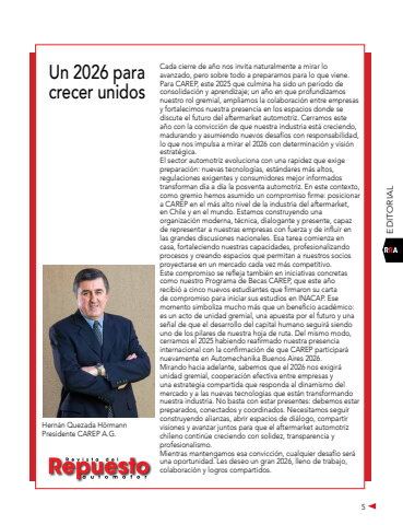 5EDITORIALHern%u00e1n Quezada H%u00f6rmannPresidente CAREP A.G.Un 2026 para crecer unidosCada cierre de a%u00f1o nos invita naturalmente a mirar lo avanzado, pero sobre todo a prepararnos para lo que viene. Para CAREP, este 2025 que culmina ha sido un per%u00edodo de consolidaci%u00f3n y aprendizaje; un a%u00f1o en que profundizamos nuestro rol gremial, ampliamos la colaboraci%u00f3n entre empresas y fortalecimos nuestra presencia en los espacios donde se discute el futuro del aftermarket automotriz. Cerramos este a%u00f1o con la convicci%u00f3n de que nuestra industria est%u00e1 creciendo, madurando y asumiendo nuevos desaf%u00edos con responsabilidad, lo que nos impulsa a mirar el 2026 con determinaci%u00f3n y visi%u00f3n estrat%u00e9gica.El sector automotriz evoluciona con una rapidez que exige preparaci%u00f3n: nuevas tecnolog%u00edas, est%u00e1ndares m%u00e1s altos, regulaciones exigentes y consumidores mejor informados transforman d%u00eda a d%u00eda la posventa automotriz. En este contexto, como gremio hemos asumido un compromiso firme: posicionar a CAREP en el m%u00e1s alto nivel de la industria del aftermarket, en Chile y en el mundo. Estamos construyendo una organizaci%u00f3n moderna, t%u00e9cnica, dialogante y presente, capaz de representar a nuestras empresas con fuerza y de influir en las grandes discusiones nacionales. Esa tarea comienza en casa, fortaleciendo nuestras capacidades, profesionalizando procesos y creando espacios que permitan a nuestros socios proyectarse en un mercado cada vez m%u00e1s competitivo.Este compromiso se refleja tambi%u00e9n en iniciativas concretas como nuestro Programa de Becas CAREP, que este a%u00f1o recibi%u00f3 a cinco nuevos estudiantes que firmaron su carta de compromiso para iniciar sus estudios en INACAP. Ese momento simboliza mucho m%u00e1s que un beneficio acad%u00e9mico: es un acto de unidad gremial, una apuesta por el futuro y una se%u00f1al de que el desarrollo del capital humano seguir%u00e1 siendo uno de los pilares de nuestra hoja de ruta. Del mismo modo, cerramos el 2025 habiendo reafirmado nuestra presencia internacional con la confirmaci%u00f3n de que CAREP participar%u00e1 nuevamente en Automechanika Buenos Aires 2026.Mirando hacia adelante, sabemos que el 2026 nos exigir%u00e1 unidad gremial, cooperaci%u00f3n efectiva entre empresas y una estrategia compartida que responda al dinamismo del mercado y a las nuevas tecnolog%u00edas que est%u00e1n transformando nuestra industria. No basta con estar presentes: debemos estar preparados, conectados y coordinados. Necesitamos seguir construyendo alianzas, abrir espacios de di%u00e1logo, compartir visiones y avanzar juntos para que el aftermarket automotriz chileno contin%u00fae creciendo con solidez, transparencia y profesionalismo. Mientras mantengamos esa convicci%u00f3n, cualquier desaf%u00edo ser%u00e1 una oportunidad. Les deseo un gran 2026, lleno de trabajo, colaboraci%u00f3n y logros compartidos.