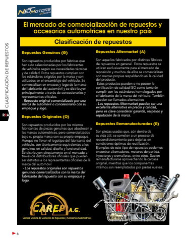 6CLASIFICACI%u00d3N DE REPUESTOSRepuestos Genuinos (G)Son repuestos producidos por fabricas que han sido seleccionadas por los fabricantes de veh%u00edculos seg%u00fan sus necesidades t%u00e9cnicas y de calidad. Estos repuestos cumplen con los est%u00e1ndares exigidos por la marca y son utilizados en el ensamblaje del veh%u00edculo. Se comercializan en envases y logo de la marca del fabricante del autom%u00f3vil y se distribuyen principalmente a trav%u00e9s de concesionarios y representantes oficiales.- Repuesto original comercializado por una marca de autom%u00f3vil o concesionario con su empaque y logo.Repuestos Originales (O)Son repuestos producidos por los mismos fabricantes de piezas genuinas que abastecen a las marcas automotrices, pero comercializados bajo su propia marca con su propio empaque. Aunque no llevan el logotipo del fabricante del veh%u00edculo, son t%u00e9cnicamente equivalentes a los genuinos en calidad, dise%u00f1o y funcionalidad. Se distribuyen directamente en el mercado a trav%u00e9s de distribuidores oficiales que pueden ser distintos a los representantes oficiales de la marca del autom%u00f3vil%u00a0%u00a0- Los repuestos originales son repuestos genuinos comercializados con la marca del fabricante del repuesto con su empaque y logo.Repuestos Aftermarket (A)Son aquellos fabricados por distintas f%u00e1bricas de repuestos en general . Estos repuestos se utilizan exclusivamente para el mercado de reposici%u00f3n y muchos de ellos se comercializan con marcas propias respaldando as%u00ed la calidad del producto.Estos productos pueden o no poseer la certificaci%u00f3n de calidad ISO como tambi%u00e9n cumplir con los est%u00e1ndares homologados por el fabricante de la marca del veh%u00edculo. Tambi%u00e9n pueden ser llamados alternativos - Los repuestos Aftermarket pueden ser una excelente alternativa en precio y calidad, pero es clave considerar garant%u00eda, respaldo y reputaci%u00f3n de la marca.Repuestos Remanufacturados (R)Son piezas usadas que, a%u00fan dentro de su vida %u00fatil, se someten a un proceso de reacondicionamiento para dejarlas en condiciones %u00f3ptimas de reutilizaci%u00f3n. Ejemplos de este tipo de repuestos podemos encontrar alternadores, motores de partida, inyectores y cremalleras, entre otros. Suelen remanufacturarse aprovechando la carcasa original, mientras que los componentes internos son reemplazados por piezas nuevas.El mercado de comercializaci%u00f3n de repuestos y accesorios automotrices en nuestro pa%u00edsC%u00e1mara Chilena de Comercio de Repuestos y Accesorios AutomotricesClasificaci%u00f3n de repuestos